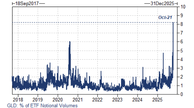 黄金此轮暴跌主要源于技术性止损与高频资金的系统化平仓,基本面并未恶化。黄金大跌当日海顺优配,全球最大的黄金ETF(GLD)持仓量仅下降0.6%;美国零售端及中国ETF逆势增持;CMX黄金未平仓合约仅降0.75%;ETF流出规模与跌势明显不匹配。本轮抛售很大概率源于系统化或模型驱动的平仓行为,可能由短期GLD期权交易触发,并被高频做市商放大。