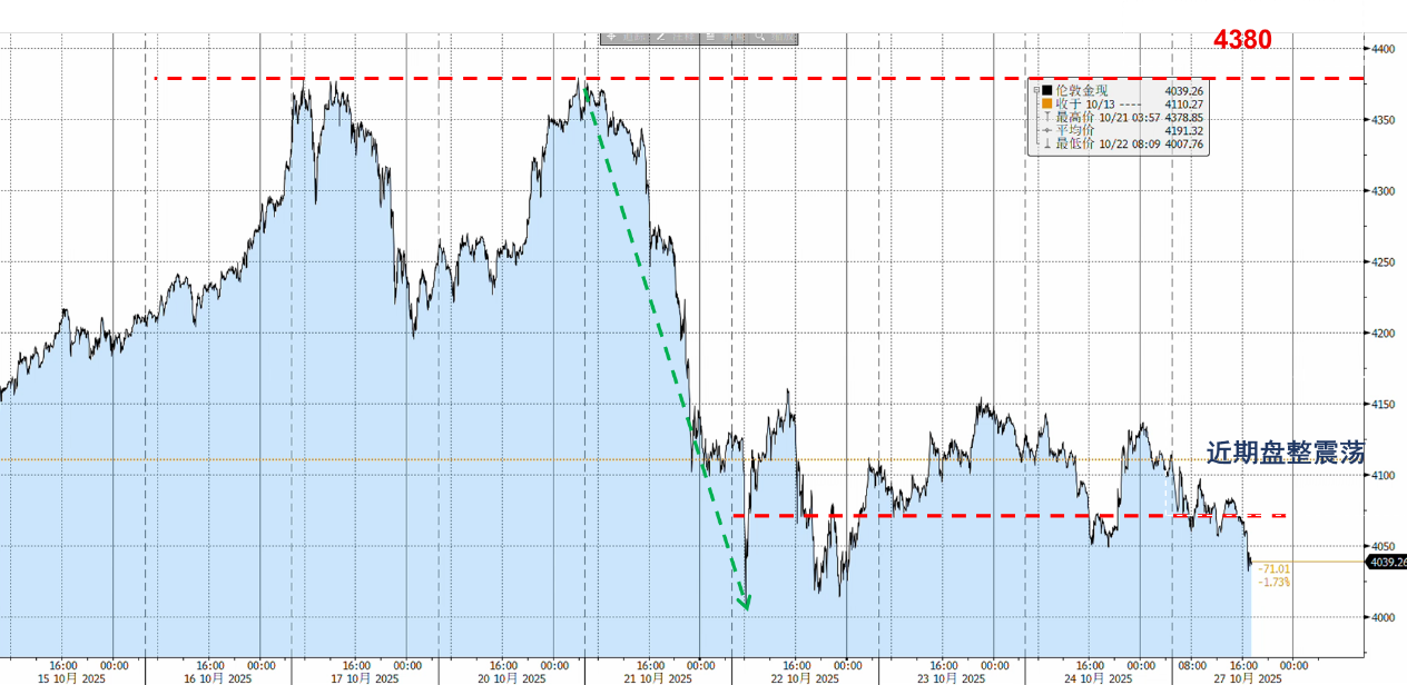 现货黄金自8月底走出震荡后海顺优配,截至10月21日黄金大跌前,涨幅超过28.4%,逼近4400美元/盎司关口。而10月21日市场情绪快速调整,伦敦金现暴跌5.3%,创近12年来最大单日跌幅。随着大跌后风险情绪改善,黄金目前已进入震荡盘整阶段。